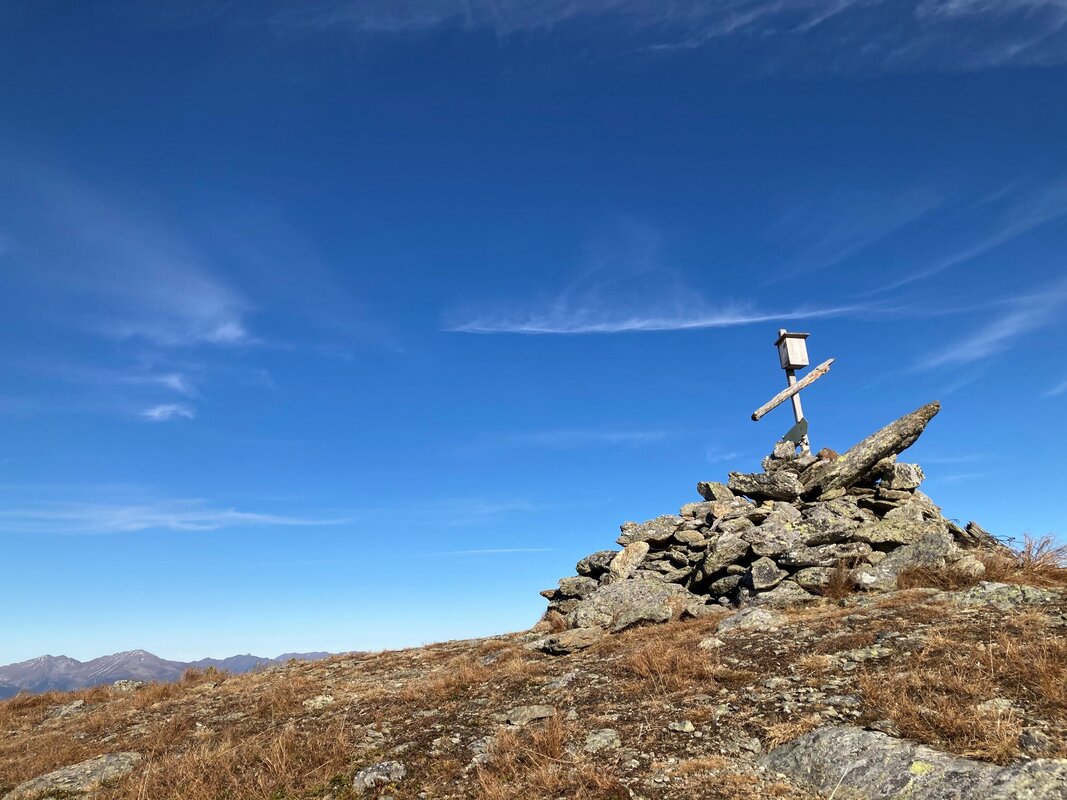 In late autumn, by chance, you can already spot a white inconspicuous ptarmigan now and then. An always continuing easy ascent brings you to the Schwarmbrunnhöhe. Arrived at the most prominent point of your hike, the Prankerhöhe, you have earned a real mountain snack. With relish you unpack the delicacies. Hungry, you pounce on the delicacies. The deep blue sky gives you a view as far as Carinthia to the Karawanken and Lienz Dolomites.