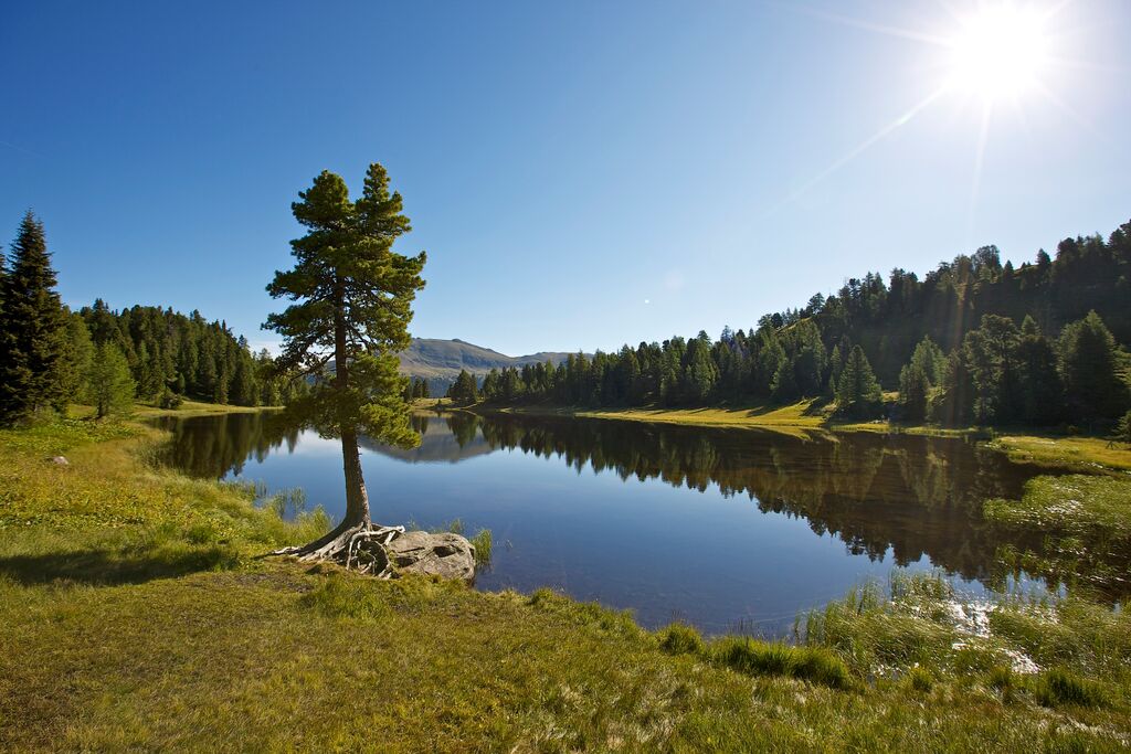 The path of the senses leads around the three mountain lakes of Austria's largest stone pine forest. The Turracher Höhe is a high plateau at 1,763 m in the middle of the Nockberge mountains. The Turracher lake, Scharzsee and Grünsee are framed by the peaks. This hike is especially recommended in autumn when the colors in the forests are bright.
